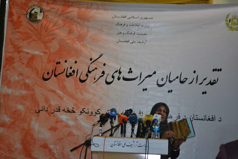 خانم صدیقه بلخی، یک جلد قرآن را که نسخه آن به ۳۰۰ سال قبل بر می گردد به آرشیف ملی افغانستان اهداء کرد.