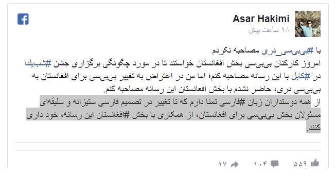 آقای حکیمی در بخشی از یک پیام در صفحۀ فیسبوکش نوشت: «در اعتراض به تغییر بیبیسی برای افغانستان به بیبیسی دری، حاضر نشدم با بخش افعانستان این رسانه مصاحبه کنم.»