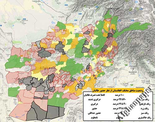 کمیسیون امور فرهنگی امارت اسلامی» مربوط به طالبان با انتشار نقشهای مناطق تحت کنترل و نفوذ و مناطقی که در آنها با نیروهای دولتی درگیر است را در افغانستان مشخص کرد.
