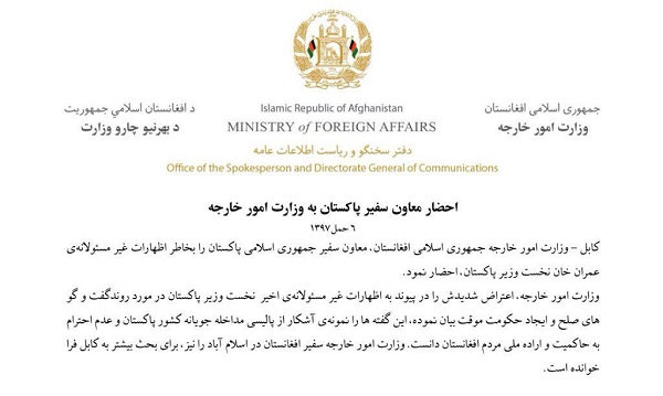 به گزارش خبرگزاری رشد، وزارت امور خارجه افغانستان بانشر خبرنامهای گفته است که معاون سفیر پاکستان را با توجه به بیانیههای غیرمسوولانه اخیر عمران خان نخست وزیر این کشور احضار کرده است.