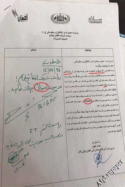 به اساس این سند شرکت مخابراتی سلام به منظور تشویق و تمجید هر چه بیشتر وکلای محترم، معزز و منتخب پارلمان به تعداد صد قطعه سیم کارت سلام نوع دایموند یا الماسی ( قیمت هر یک این شماره ها در بازار یکصدهزار افغانی میباشد) با پیش پرداخت ماهانه هزار افغانی توزیع می نماید البته نوعیت این سیمکارت ها مخفی یا نونمبر بوده تا وکلای معظم و باشرف ما بتواند بدون ملحوظات امنیتی به کارهای سیاه و مافیایی خود ادامه بدهند.